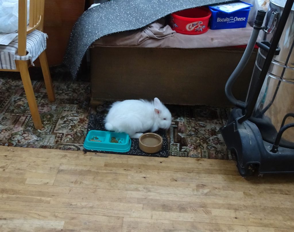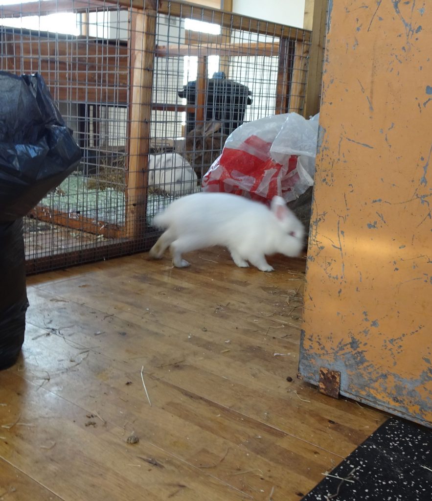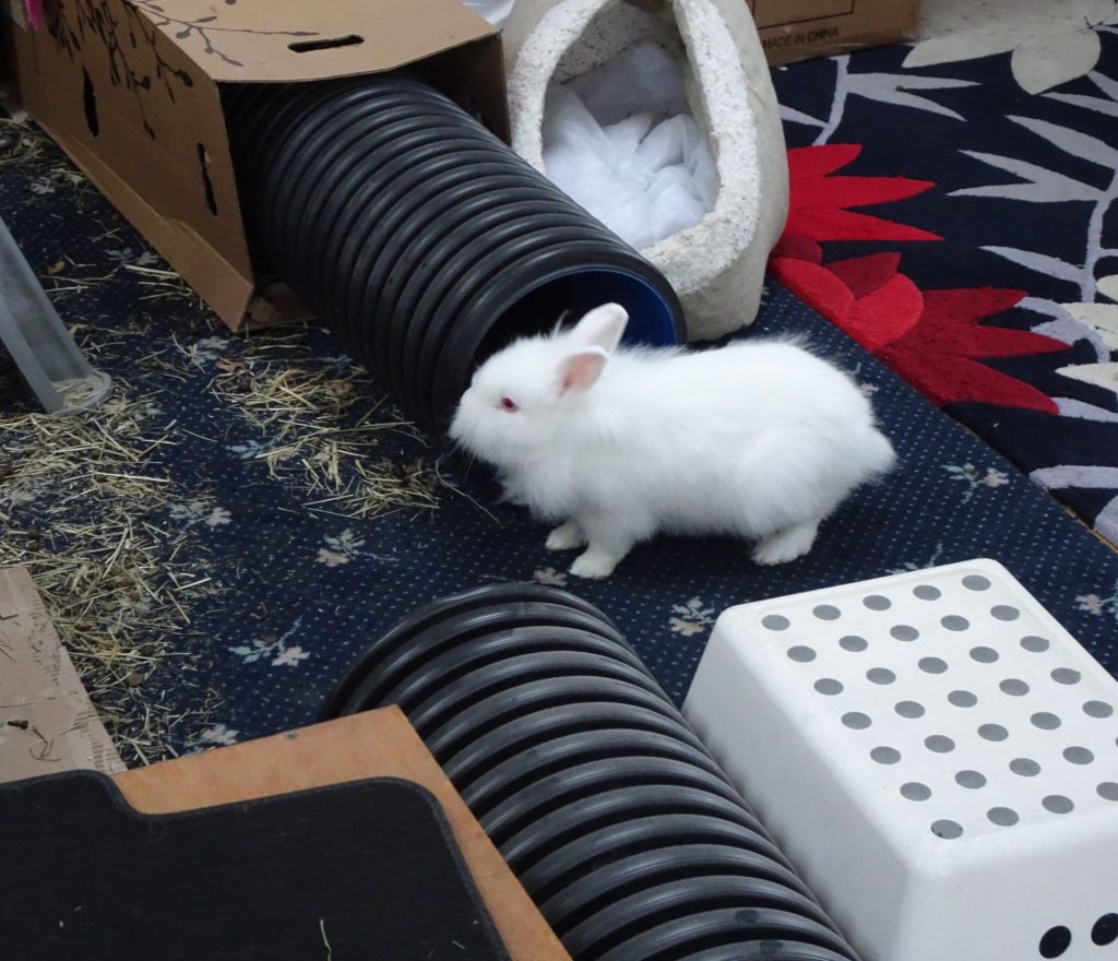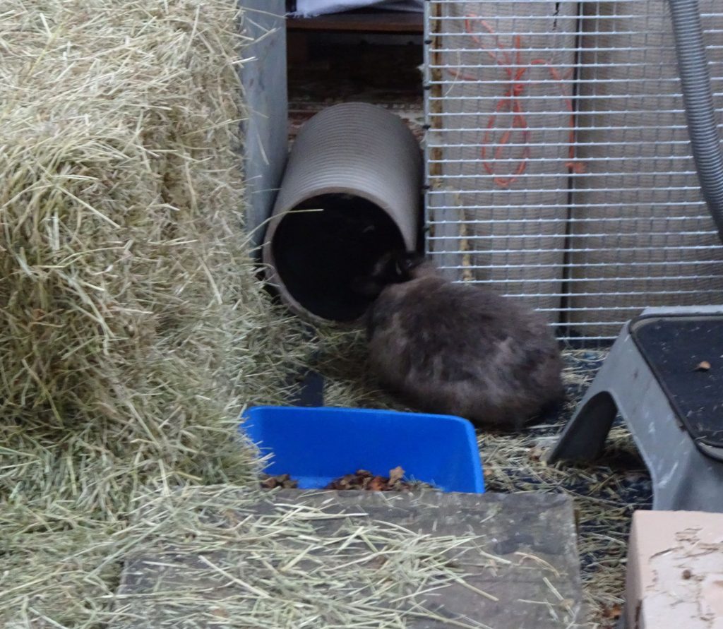 Poppy then visits Tilly & Peanut’s pen.Now she’s off to visit Teddy & Daisy.Meanwhile Toffee has a good smell outside Annie & Thumper’s pen.Poppy joins Toffee.Not for long as she grabs some food & drink.Toffee explores the pipe.Poppy explores a pipe too.She’s got a really good smell now.The smell leads her to the cat bed.Time for a relax & a quick wash after all that exploring.